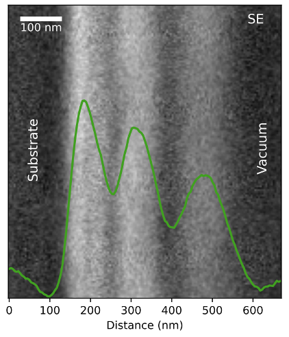 Figure 1. (a) BSE image of the 22-layer coating acquired in the VPSEM, looking at the polished cross section (edge view). (b) SE image of the 5-layer coating, acquired in the JEOL SEM. The green line represents the vertically integrated image intensity [1].
